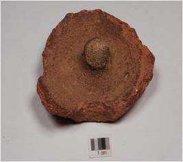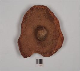 | Description / विवरण | A fragment of red ware lid, having projected knob and flat base, edge are broken, medium fabric and well baked. |
