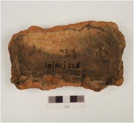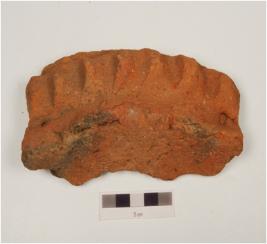 | Description / विवरण | Base fragment of red ware trough, knuckle design on exterior surface, flat base, smoky section and coarse fabric. |