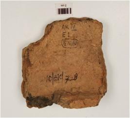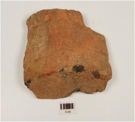 | Description / विवरण | Fragment of red ware trough, knuckle design on exterior surface, vertical profile, flat base, smoky section and medium fabric. |