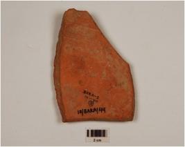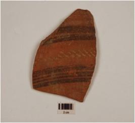 | Description / विवरण | Fragment of a vase of redware painted in black horizontal bands and incised bipinnate design on the surface, of medium fabric showing an oxidized core and treated with red slip. |