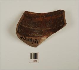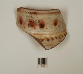 | Description / विवरण | Fragment of a vase of glazed ware,has a vertical neck and decorated with horizontal line,bosses and a row of dots in brown pigment against white pigment. |