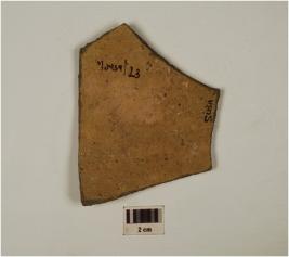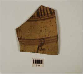 | Description / विवरण | A fragment of buff ware,painted with horizontal line semicircle filled with horizontal line in black pigment on surface of medium fabric,showing an oxidized core. |