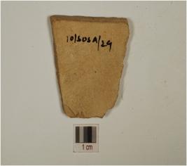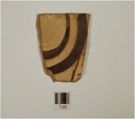 | Description / विवरण | A fragment of bowl of red ware,slightly outcurved rim painted with horizontal lines with zig zag design and fish design on above the horizontal bands in black pigment on surface,of medium fabric,showing an oxidized core,treated with red slip on exterior. |
