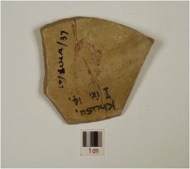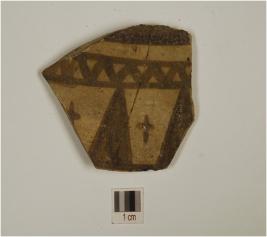 | Description / विवरण | A fragment of buff ware,painted with filled horizontal line in zig zag design above solid triangle design with plus symbols alternatively in black pigment on surface,of medium fabric,showing an oxidized core,treated with buff slip on exterior. |