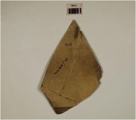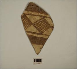 | Description / विवरण | A fragment of buff ware,painted with filled squares design in criss-cross pattern within the horizontal lines in black pigment on outer surface,treated with buff slip on exterior. |