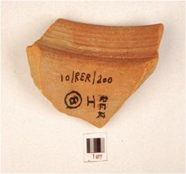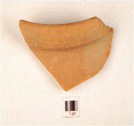 | Description / विवरण | Fragment of vase of red ware treated with red slip on both sides has externally thickened rim and concave neck. |