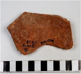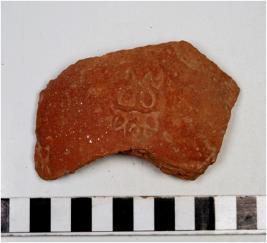 | Description / विवरण | A potsherd of red ware having floral stamp design on exterior and showing mica particles on surface of medium fabric. |