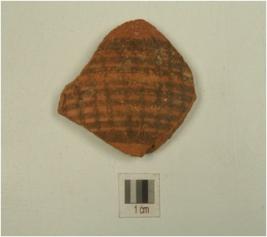 | Description / विवरण | A potsherd of a redware vessel, painted with linear pattern in black pigment on exterior and of medium fabric. |