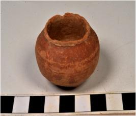 | Description / विवरण | A miniature pot of red ware with featureless rim, globular body and circular base of medium fabric. |