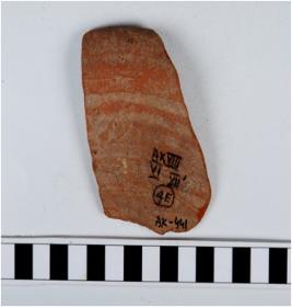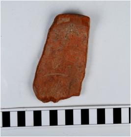 | Description / विवरण | A fragment of a dish of red ware with incurved thickened rim, flat base, of medium fabric. |