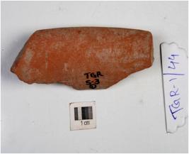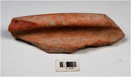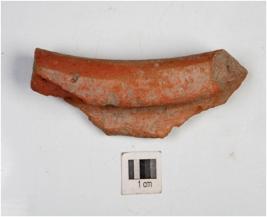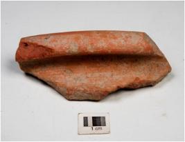 | Description / विवरण | A fragment of a red ware with out turned rim and straight lines. |