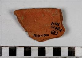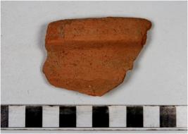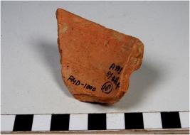 | Description / विवरण | A fragment of a pot of red ware with externally thickened rim, oblique sides of medium fabric rough surface. |