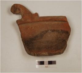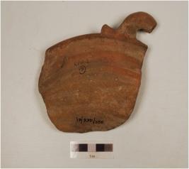 | Description / विवरण | A fragment of a pan of red ware, nail headed rim, with a broken lug handle convex profile, flat base of medium fabric, showing an oxidized core and treated with red slip. |