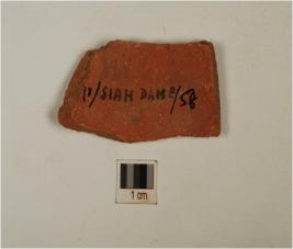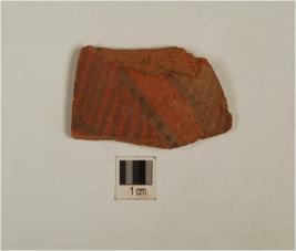 | Description / विवरण | A fragment of pot of red ware, painted with hatched leaves in black pigment on the exterior. |