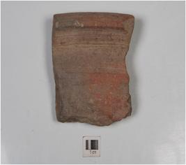 | Description / विवरण | A fragment of a pot of red ware with slightly out turned thickened flanged rim. |