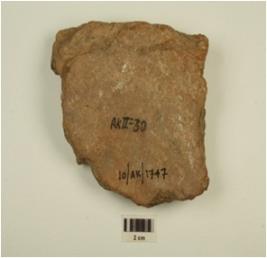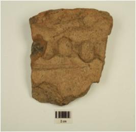 | Description / विवरण | A fragment of a basin of red ware,flat top rim applique knuckle design & horizontal line on the profile,of coarse fabric,showing an incomplete oxidized core and treated with red slip. |
