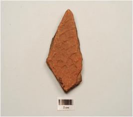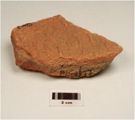 | Description / विवरण | A fragment of red ware decorated with incised pattern, medium fabric and showing an oxidized core. |
