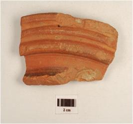 | Description / विवरण | Pot shard of red ware, externally thickened inverted rim with two grooved lines on exterior part, well baked, medium fabric and surface treated with red slip. |