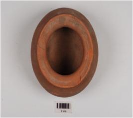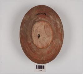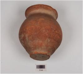 | Description / विवरण | A miniature vase of red ware, out-turned rim, concave neck, globular profile, disc base and of medium fabric. |