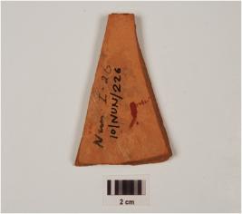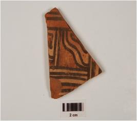 | Description / विवरण | A potsherd of buff ware, having geometrical pattern in black and white pigment on the exterior. |