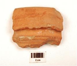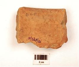 | Description / विवरण | Pot shard of red ware, in-curved rim, projected ridge on shoulder, medium fabric and surface treated with red slip. |
