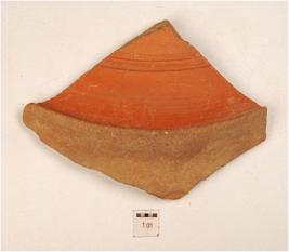 | Description / विवरण | Pot shard of red ware, projected ridge on shoulder, incised horizontal lines on neck, fine fabric and surface treated with red slip. |