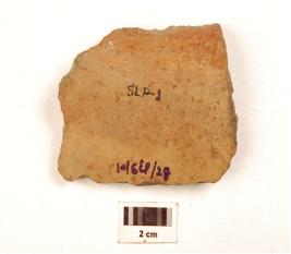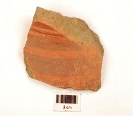 | Description / विवरण | Potsherd of a jar of red ware, decorated with three horizontal bands in black pigment, medium fabric smoky section and surface treated with red slip. |