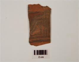 | Description / विवरण | A potsherd of red ware, painted with vertical lines wihtin horizontal lines in black pigment on red slip of fine fabric and showing an oxidized core. |