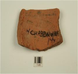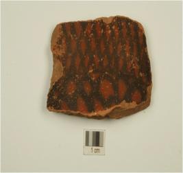 | Description / विवरण | A fragment of red ware,painted with criss-cross design in black pigment on exterior of medium fabric,showing an oxidized core and treated with red slip on exterior. |