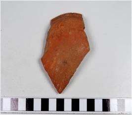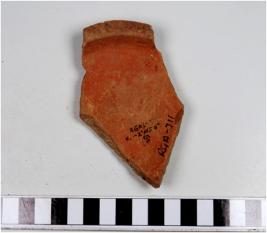 | Description / विवरण | A fragment of a red ware with featureless rim, oblique sides of medium fabric fine texture. |