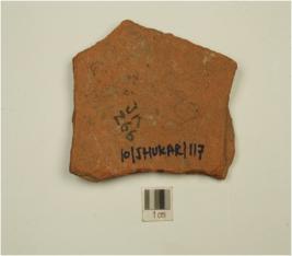 | Description / विवरण | A potsherd of red ware, decorated with wavy line with horizontal bands and followed by criss-cross design in black pigment, showing an oxidized core and treated with red slip. |