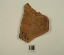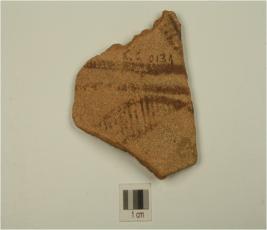 | Description / विवरण | Fragment of dull red ware, painted with two horizontal lines and hatched leaf in chocolate pigment. |