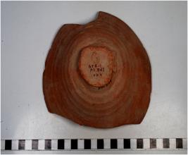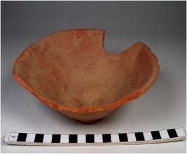 | Description / विवरण | A wide mouthed bowl of red ware with featureless broken rim, tapering profile, discular base of medium fabric. |