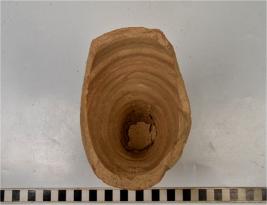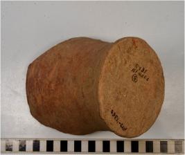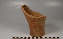 | Description / विवरण | A fragment of elongated tumbler like pot of red ware with broken rim, tapering sides, flat base of medium fabric. |