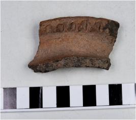 | Description / विवरण | Fragment of rim a vase of red ware with slightly out turned rim having rope design concave neck, oblique sides. |