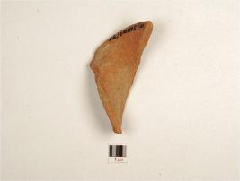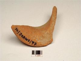 | Description / विवरण | Fragment of black on red ware miniture vase, flared rim, faded horizontal bands painted with black pigment, fine fabric, well baked and traces of red slip. |