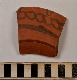 | Description / विवरण | A fragment of a rim of red ware with flanged rim having loops design on rim treated with red slip of fine fabric, fine texture well levigated. |