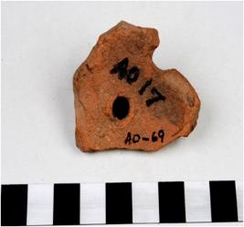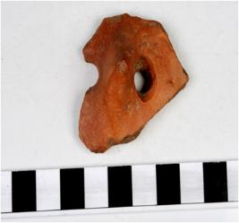 | Description / विवरण | A potsherd of a red ware showing perforation and conical knob. Of medium fabric treated with red slip. |