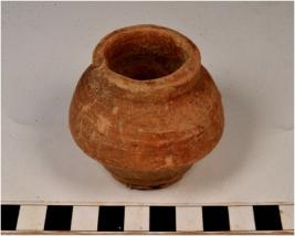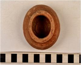 | Description / विवरण | A miniature pot of red ware with featureless rim discular base spherical profile of medium fabric. |
