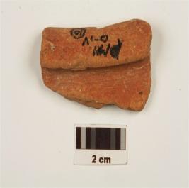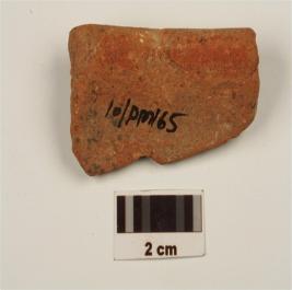 | Description / विवरण | A fragment of vase of red ware with externally thickened out turned rim, of medium fabric showing an oxidized core and treated with red slip. |