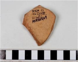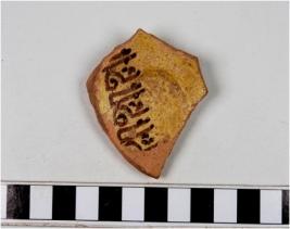 | Description / विवरण | A fragment of a base of glazed ware with broken discular base having yellowish background having script on interior. |