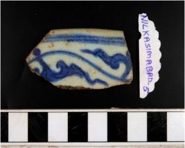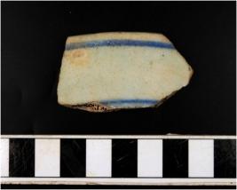 | Description / विवरण | Fragment of rim dish having sandy fire able core showing featureless rim formed in under glazed pattern showing floral design in blueish colour pick out on whitish surface. |