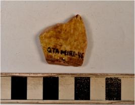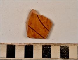 | Description / विवरण | A potsherd of glazed ware painted with brown oblique lines on yellow background on surface of medium fabric. |