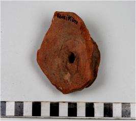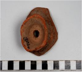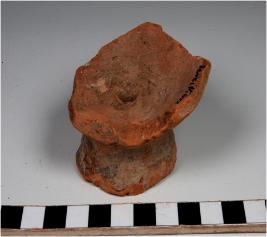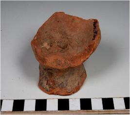 | Description / विवरण | A fragment of a base of cup on stand of red ware having hole in the centre and broken base of medium fabric. |
