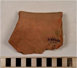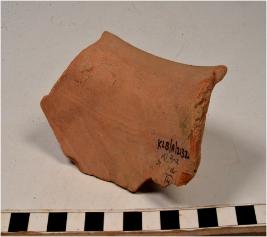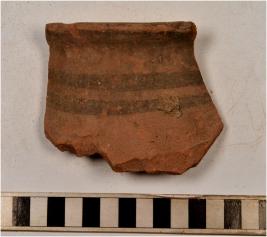 | Description / विवरण | A fragment of a vase of red ware with flared rim, concave neck and painted with black showing horizontal bands on surface of medium fabric. |