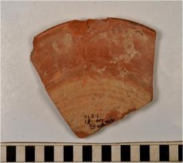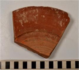 | Description / विवरण | A fragment of a dish of red ware with splayed out rim, tapering sides, flat base showing incised horizontal lines on interior, treated with red slip of fine fabric. |