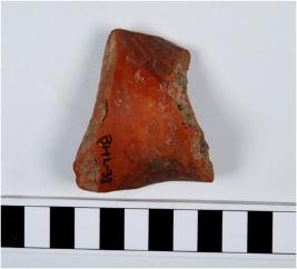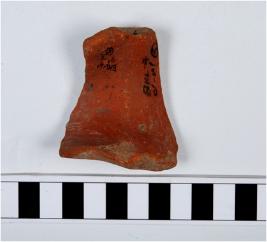 | Description / विवरण | Fragment of rim a rim of red ware with flared rim, painted with black lines on the rim, of coarse fabric. |