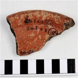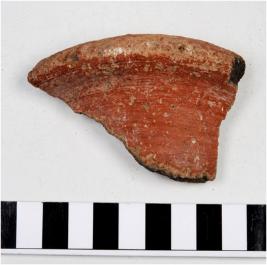 | Description / विवरण | Fragment of rim a vase of red ware with nail headed rim concave neck straight sides treated with red slip. |