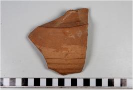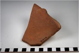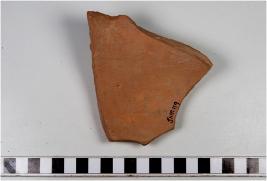 | Description / विवरण | A fragment of a pot of red ware with broken rim, concave neck bulbous profile and straight sides of thick fabric and smooth surface. |