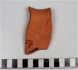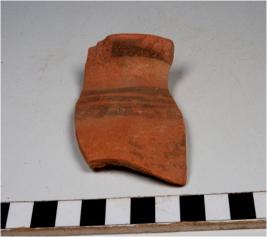 | Description / विवरण | A fragment of a vase of red ware with out turned rim, painted with black showing horizontal bands and loops design on exterior, oblique sides of fine fabric. |
